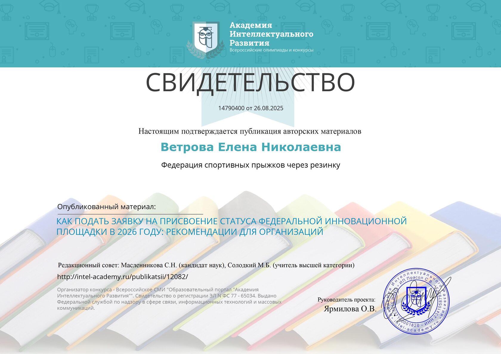 Ветрова Елена Николаевна, президент Федерации спортивных прыжков через резинку, автор проекта «Родной спорт», эксперт Всероссийского конкурса спортивных проектов «Ты в игре», победительница Национальной премии «Наш вклад» опубликовала статью "Как подать заявку на присвоение статуса федеральной инновационной площадки: рекомендации организациям".